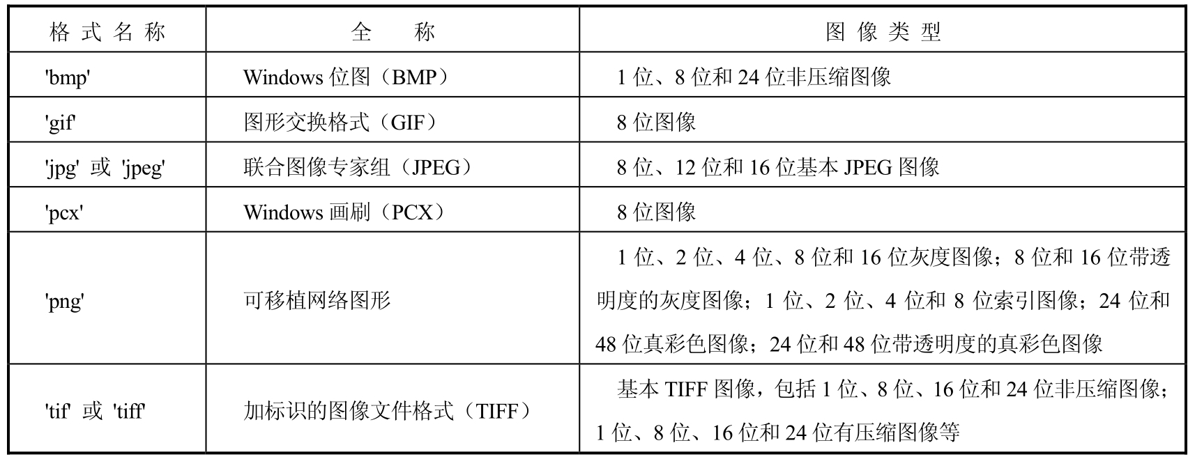 ·A=imread(filename,fmt) 从指定的图像文件中读取灰度图像或真彩色图像。字符串参量filename表示文件名;字符串参量fmt表示文件类型,具体取值可参见表1.6。