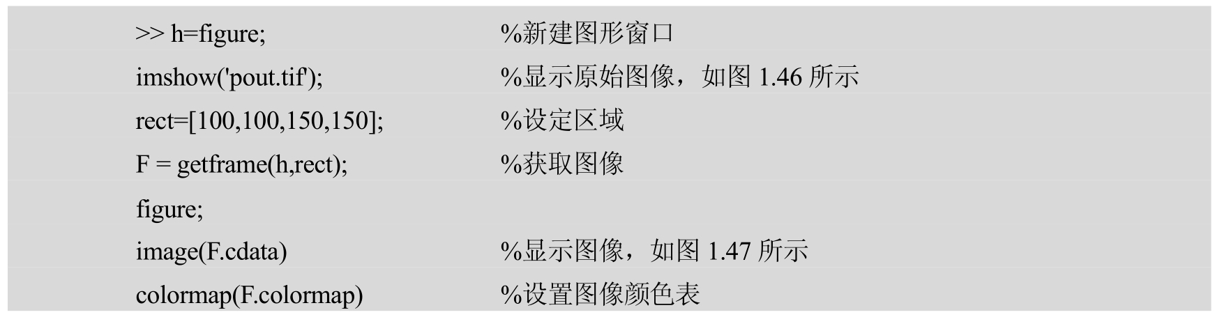 ·F=getframe(h,rect) 从句柄为h的图形窗口或轴的指定区域获取一帧动画,参量rect为四元素向量([xmin,ymin,xmax,ymax]),(xmin,ymin)表示矩阵区域左下角端点的坐标,(xmax,ymax)表示矩阵区域右上角端点的坐标。
