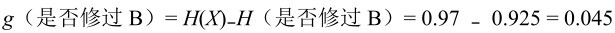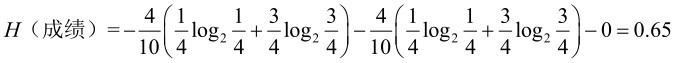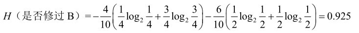 是否修过 B 课程这个属性,有修过的4个(这4个中 C 课程1个合格,3个不合格),无修过的6个(这6个中C课程3个合格,3个不合格)。利用以下式子可以计算H(是否修过B)。