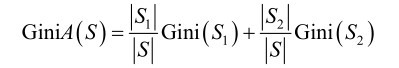 根据 CART 算法构造的是一棵二叉树,所以在 CART 算法中是用 Gini 指标进行二元划分的,对于数据集S的任何一个属性A的任何一种取值a,可以将数据集S划分成S 1 和S 2 两个子集,对应属性A,Gini指标的计算式如下: