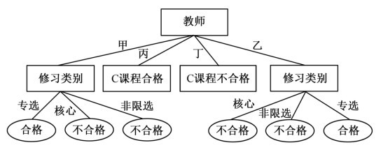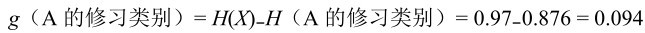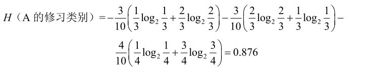 A课程作为哪类课程修习这个属性,作为核心课程的为3个(这3个中C课程1个合格,2个不合格),作为专业选修的为3个(这3个中 C 课程2个合格,1个不合格),作为非限定选修的为4个(这4个中C课程1个合格,3个不合格)。利用下面的式子可以计算H(A的修习类别):
