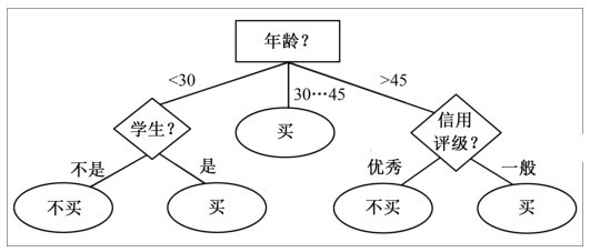 在决策树中,每个叶节点都赋予一个类标号。非终节点(Non-terminal Rode)(包括根节点和内部节点)包含属性测试条件,用以分开具有不同特性的记录。这棵决策树对销售记录进行分类,指出一个电子产品消费者是否会购买一台计算机。每个内部节点(方形框)代表对某个属性的一次检测。每个叶节点(椭圆框)代表一个类: