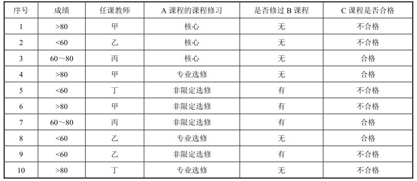 表3-3所示为某学院学生成绩数据库(训练样本集合),训练样本包含4个属性,它们分别为成绩、任课教师、A课程的修习类别、是否修过B课程。样本集合的类别属性为C课程是否合格,该属性有2个取值,即为合格和不合格。