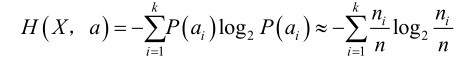 与ID3算法不同,C4.5算法挑选具有最高信息增益率的属性为测试属性。对样本集T,假设变量 a 有 k 个属性,属性取值a 1 ,a 2 ,…,a k ,对应 a 取值为 a i 的样本个数分别为n i ,若n是样本的总数,则应有n 1 +n 2 +…+n k =n。Quinlan利用属性a的熵值H(X,a)来定义为了获取样本关于属性a的信息所需要付出的代价,即: