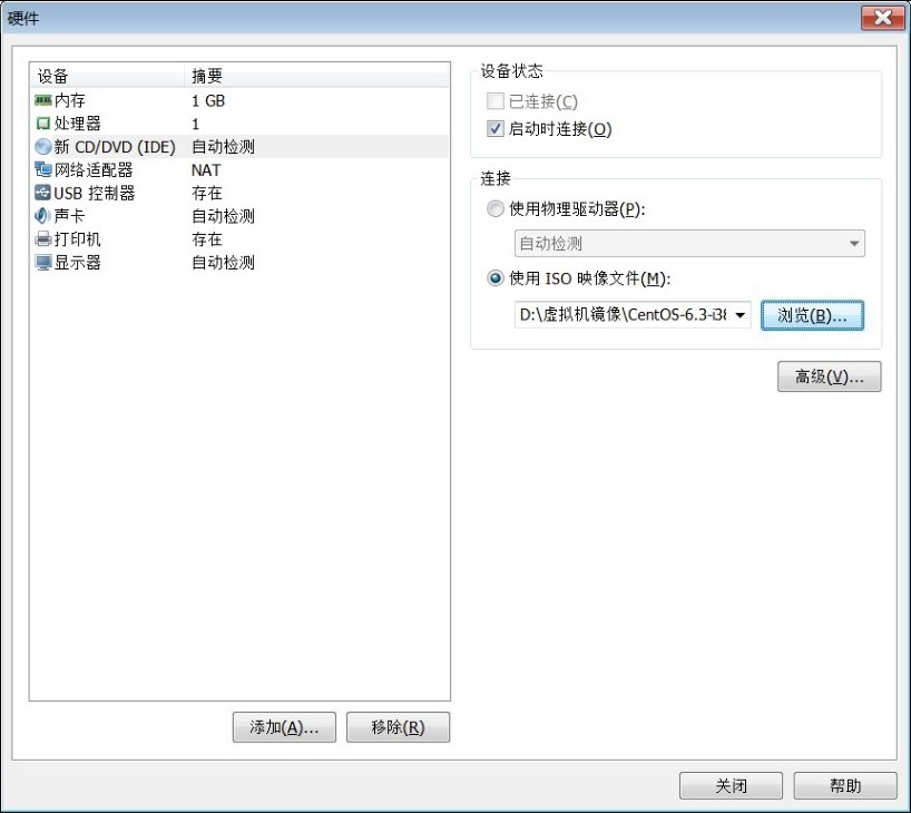 选择“新CD/DVD(IDE)”可以选择光驱配置。如果选择“使用物理驱动器”,则虚拟机会使用宿主机的物理光驱;如果选择“使用ISO映像文件”,则可以直接加载ISO映像文件,单击“浏览”按钮找到ISO映像文件位置即可,如图2-10所示。