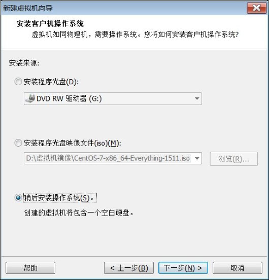 单击“下一步”按钮进入“安装客户机操作系统”界面,这里选择“稍后安装操作系统”。如果选择“安装程序光盘”或“安装程序光盘映像文件(iso)”,那么VMware会帮助用户自动安装一个最小化的Linux操作系统,安装过程完全不用用户参与。这样做的好处是安装简单,适合初学者;坏处是完全不能干预安装过程,包括系统分区过程等,就失去了学习的意义,所以选择“稍后安装操作系统”,如图2-4所示。