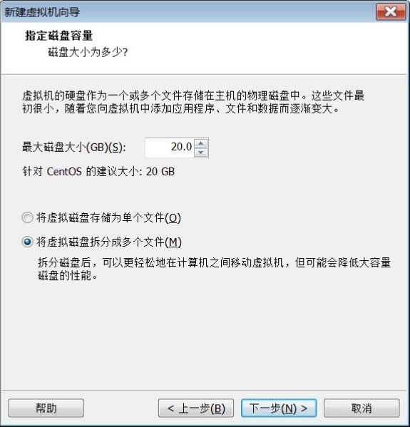 单击“下一步”按钮,进入“指定磁盘容量”界面。默认虚拟的硬盘大小为20GB(虚拟出来的硬盘会以文件形式存放在虚拟机系统安装目录中)。虚拟硬盘的空间可以根据需要调整大小,但不用担心其占用的空间,因为实际占用的空间还是以安装的系统大小而非此处划分的硬盘大小为依据的。比如你设定了硬盘容量为20GB,但是安装Linux只用了4GB,那么实际上只会在你的Windows分区中占用4GB的空间,占用空间会随着虚拟机系统使用的空间增加而增加,如图2-7所示。