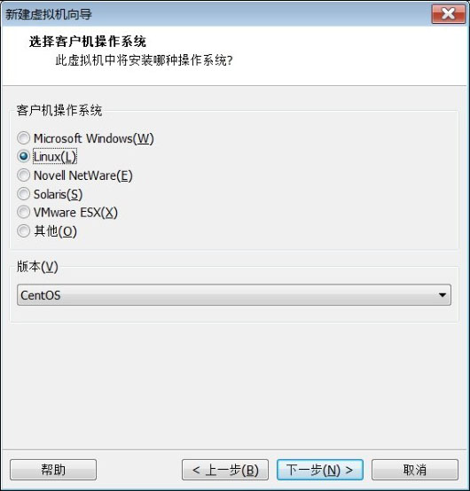 单击“下一步”按钮,进入“选择客户机操作系统”界面,选择“Linux”,然后在“版本”下拉列表框中选择要安装的对应的Linux版本,这里选择“CentOS”,如图2-5所示。