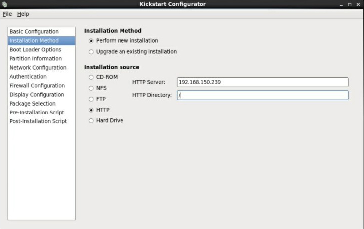 ●Installation Method(安装方法)界面:选择“Perform new installation(执行新安装)”,Installation source选择“HTTP”,指定HTTP服务器的IP地址和HTTP目录(这里写“/”),如图2-50所示。