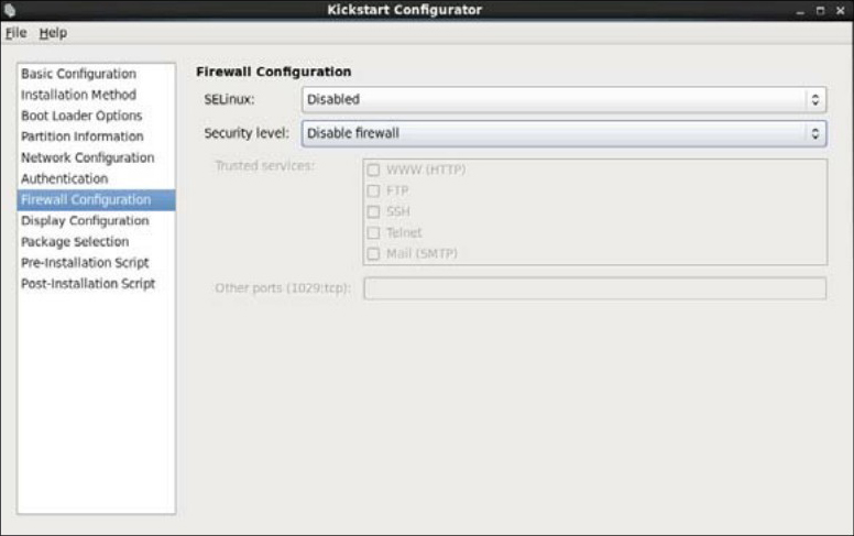 ●Firewall Configuration(防火墙配置)界面:SELinux选择为Disabled(关闭),Security level选择为Disable firewall(关闭),如图2-53所示。