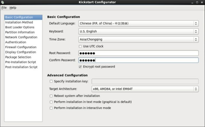 ●Basic Configuration(基本配置)界面:调整语言、时区和root口令等,如图2-49所示。