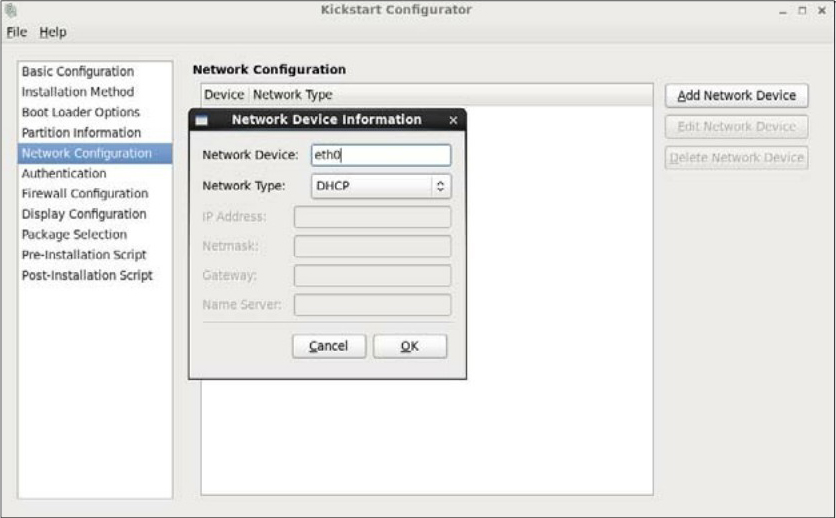 ●Network Configuration(网络配置)界面:单击“Add Network Device(添加网络设备)”按钮,输入网络设备名,此处指定为eth0;输入网络类型,此处指定为DHCP,如图2-52所示。