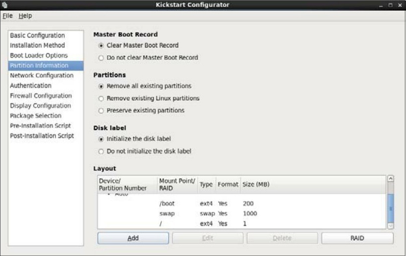 ●Partition Information(分区信息)界面:选择“Clear Master Boot Record(清除主引导记录)”,选择“Remove all existing partitions(删除所有现存分区)”,否则在安装到分区步骤时,会出现确认提示,无法实现全自动安装。然后单击“Add(添加)”按钮添加所需分区,这里我们划分了/boot分区、swap分区和/分区,如图2-51所示。