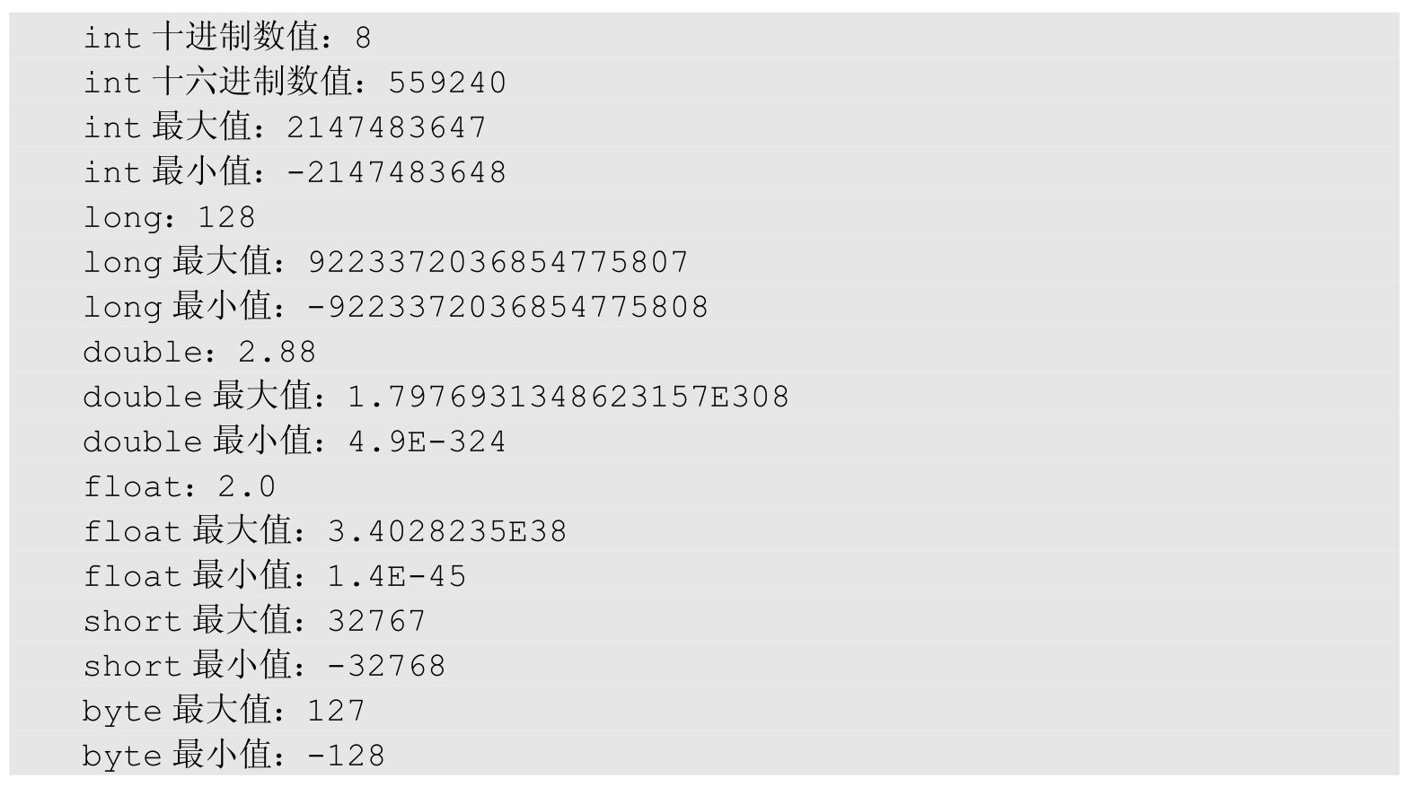 · 整型:包含最小的16位的short类型,最常见的32位int类型和最大64位长整型long类型。