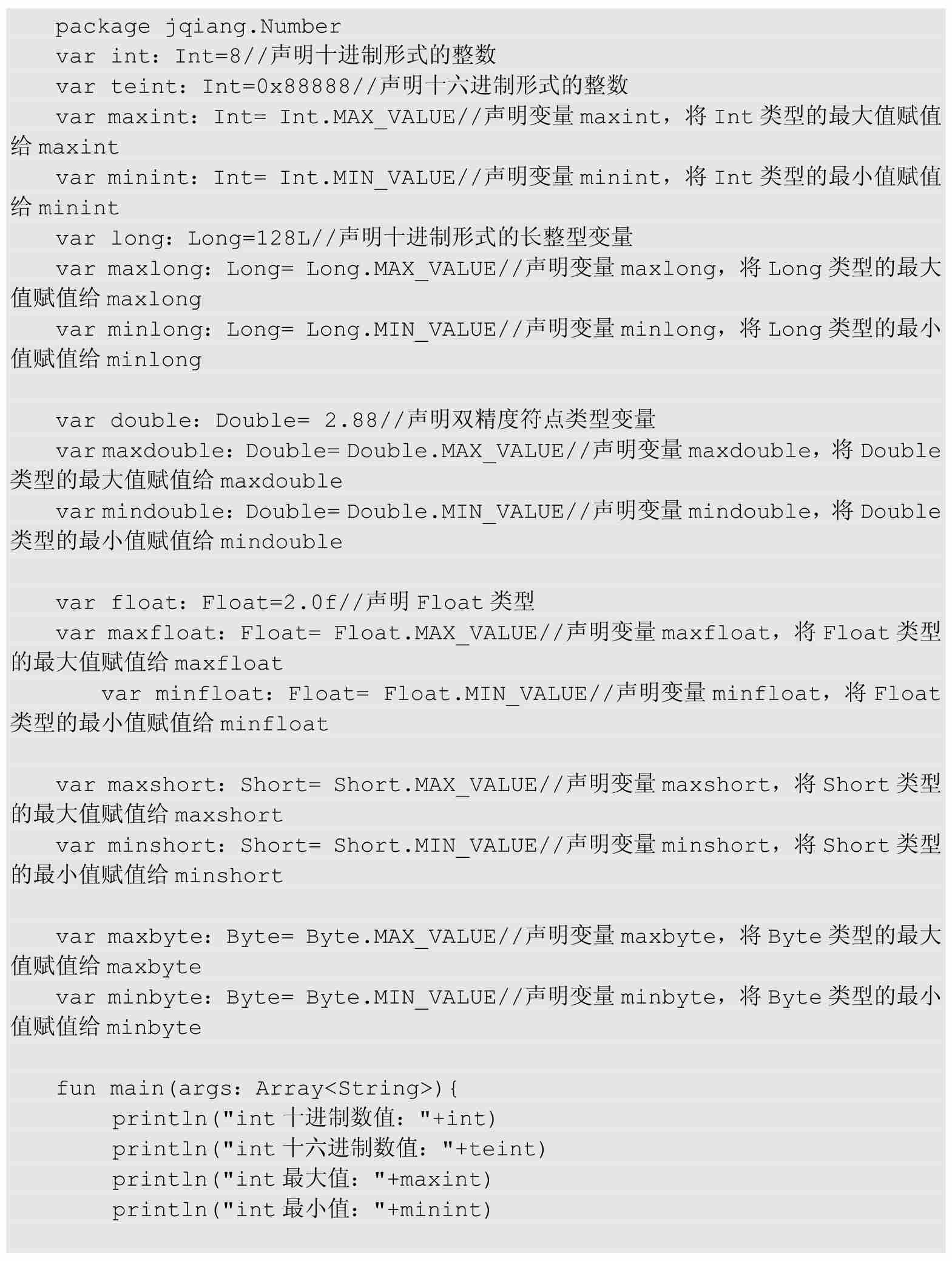 在上面例子中有几个特殊的值,如0x88888、2.0f,这样的值在Kotlin中有一个具体的名称,即字面常量。
