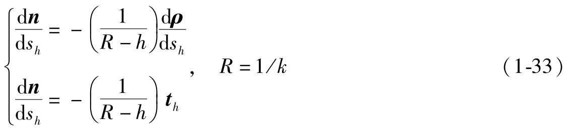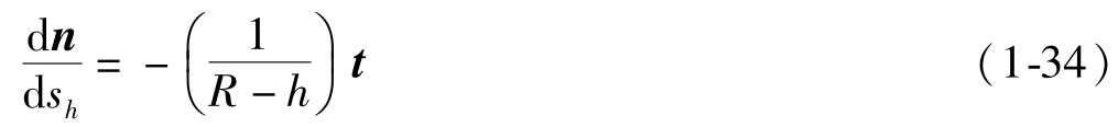 式 (1-34) 表明:等距曲面S和S h 在对应点有相同的主方向t;若S上点的主曲率为k=1/R,则S h 上对应点的主曲率为
