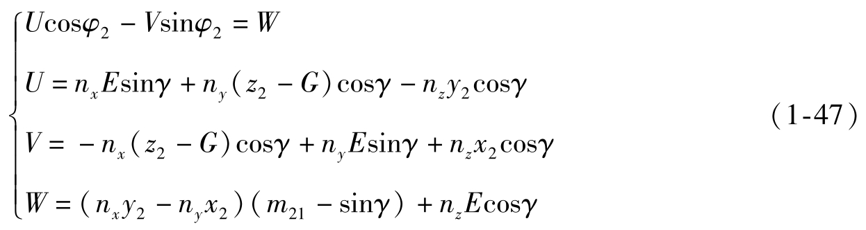 假设产形轮∑ (2) 曲面参数为u、θ,齿面方程用r 2 (u,θ)=[x 2 ,y 2 ,z 2 ] T 表示,根据图1-16坐标系中的相应关系,可由啮合方程