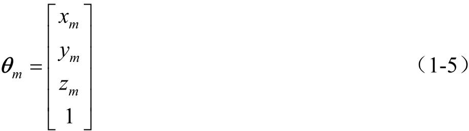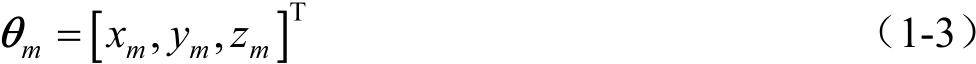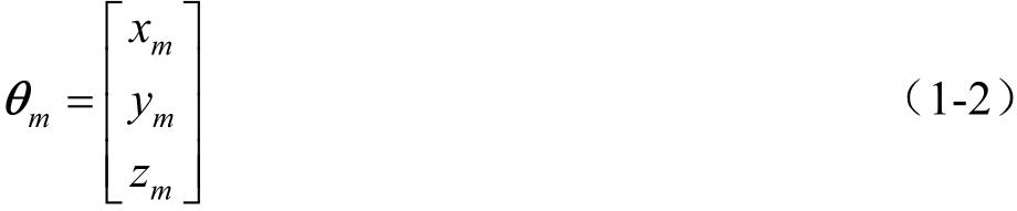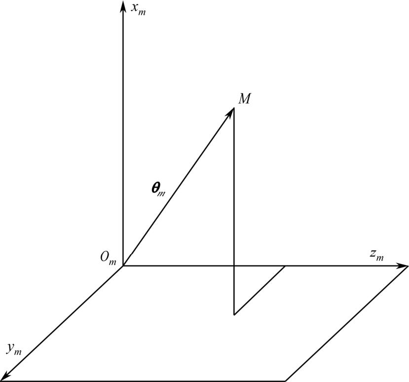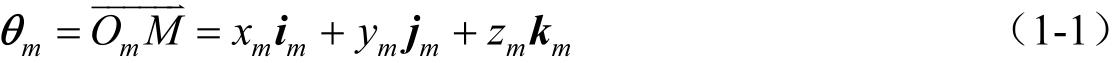 式中,下角标“ m ”指明,位置矢量表示在坐标系 S m ( x m , y m , z m )中。在标记矢量时,可以采用行矩阵表示位置矢量。