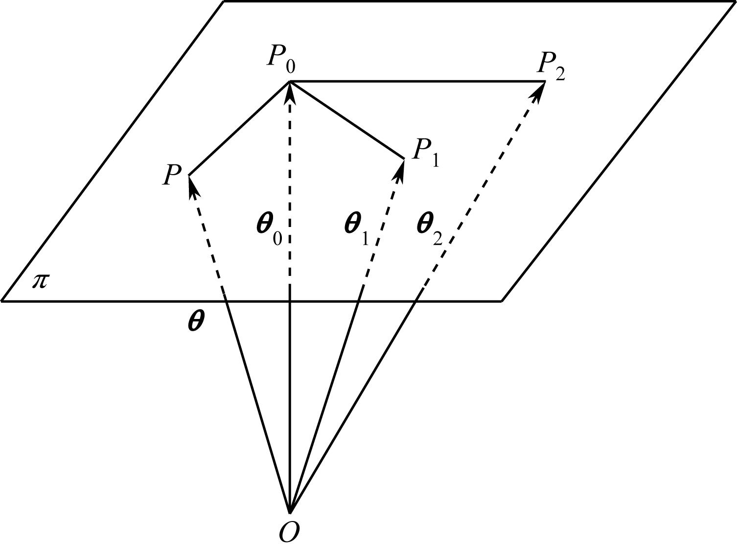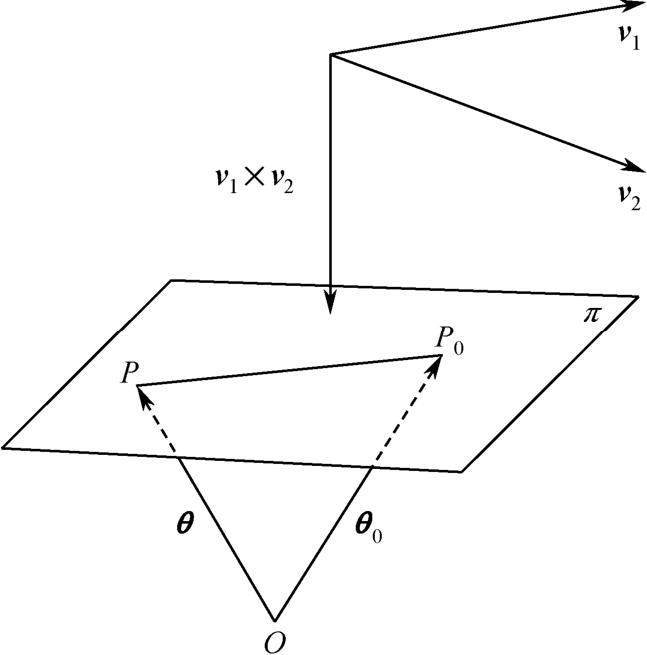 v 1 v 2 为平行于 π 平面、彼此不平行的两个矢量。由于 P 0 P = θ θ 0 与( v 1 × v 2 )相垂直,如图1-5所示,则 π 平面的矢量方程可写成