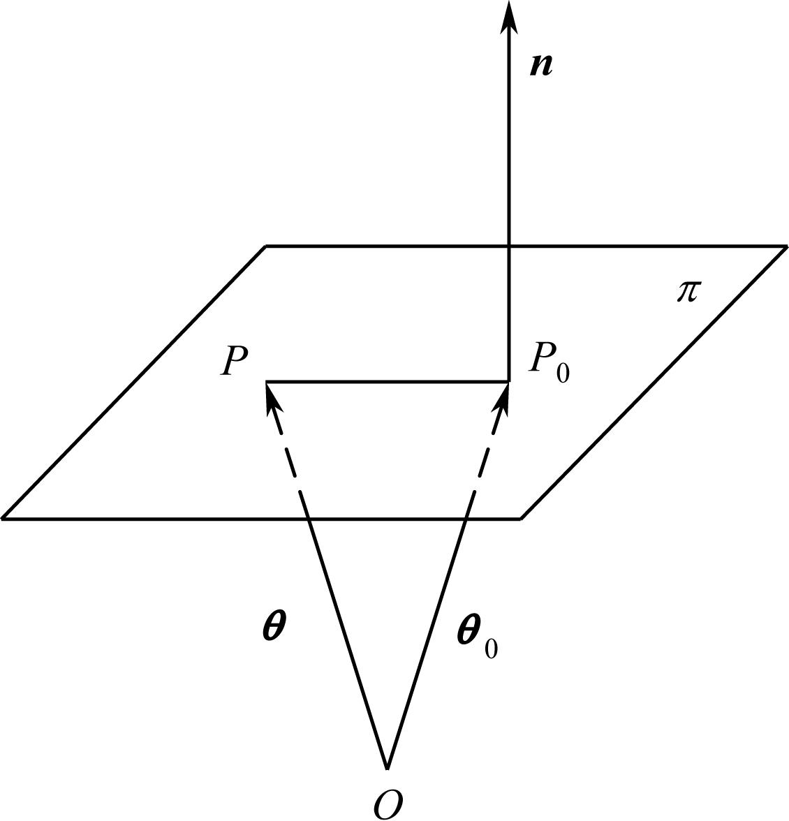 如图1-4所示, P 0 π 平面上的已知点,其径矢为 θ 0 n 为与 π 平面垂直的不等于零的矢量。若 θ π 平面上任意点的径矢,则 P 0 P = θ θ 0 ,且与 n 相垂直,故 π 平面的矢量方程为