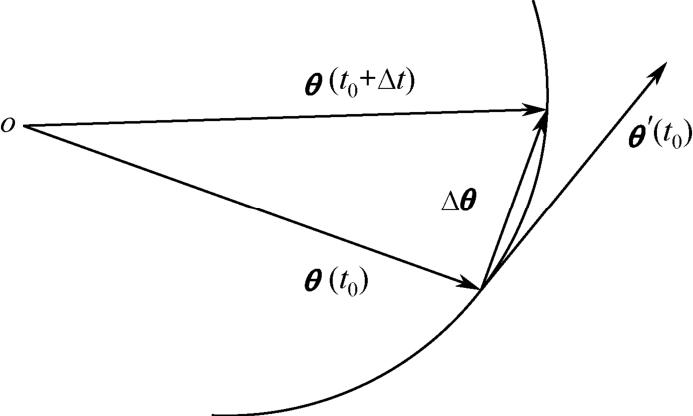 θ ( t )的矢端轨迹为一条曲线,则Δ θ 是该曲线上参数分别为 t 0 t 0 t 的两点所引的弦上矢量。显然当Δ t 为正值时,Δ θ t 与Δ θ 同向,反之为异向。为了方便,统一把有向曲线 t 增加的方向作为正向,则当Δ t →0时,Δ θ t 的极限显然就是 t 0 处切线方向的矢量,并且总是指向曲线的正向,如图1-2所示。