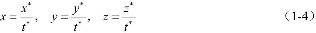 在笛卡尔坐标系中一般采用3个数( x y z )来确定位置矢量的顶点。通常,坐标变换需要使用矩阵的乘法和加法混合运算的方法。然而,如果位置矢量用齐次坐标表示,则只需要矩阵的乘法。在三维立体空间中,一个点的齐次坐标由4个数( x , y , z , t )来确定,这4个数不同时为零,并且其中只有3个数是独立数。假定 t ≠0,则普通坐标和齐次坐标之间的关系式为