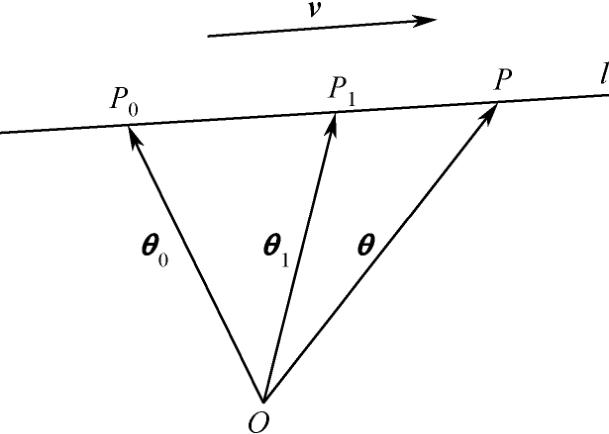 这里先讲解一下直线矢量方程,直线矢量方程的概念在本书参考文献里可以找到。直线可以用坐标函数方程表示,也可以用矢量方程表示,如图1-3所示, l 为空间任意直线, 0 P l 上的已知点,其径矢为 θ 0 v 为与 l 平行的不等于零的矢量。若 θ 为直线 l 上的任意点 P 的径矢,则直线 l 的参数方程为