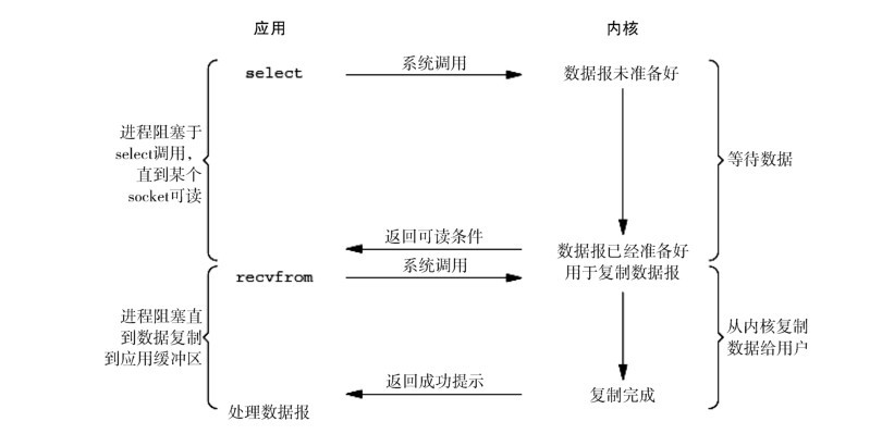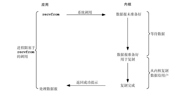 在图1-4中,进程阻塞的整段时间是指从调用recvfrom函数开始到它返回的这段时间,当进程返回成功提示时,应用进程开始处理数据报。