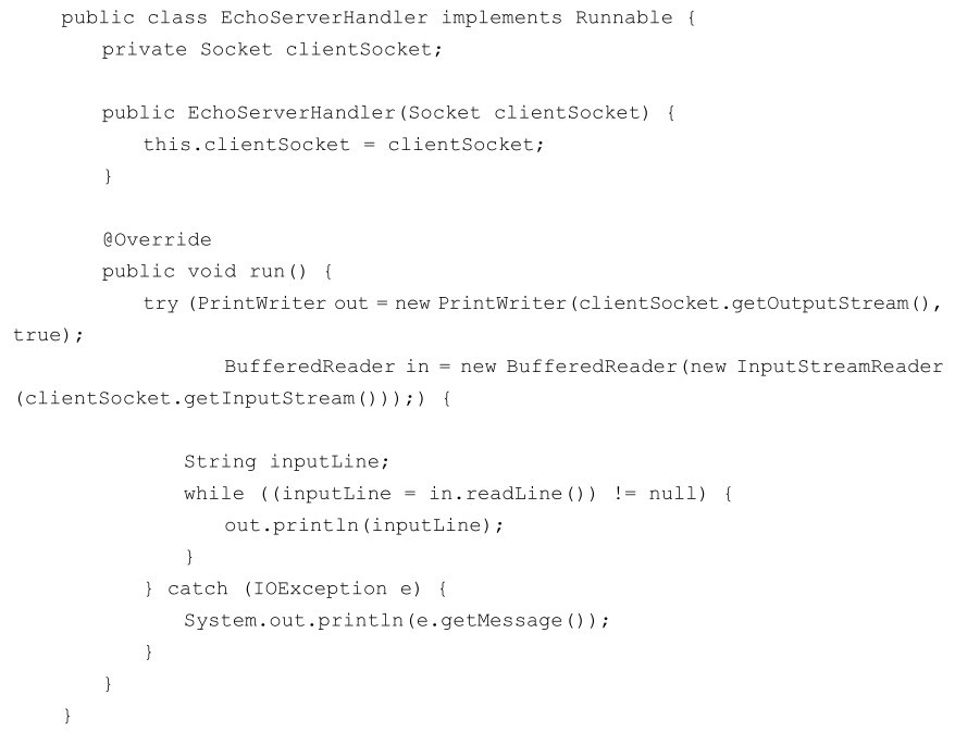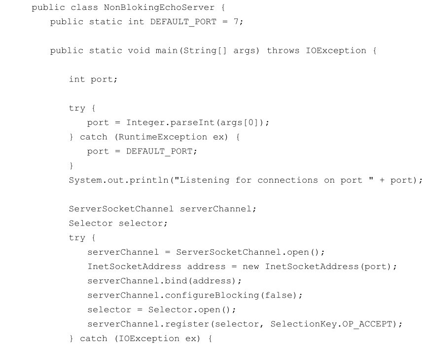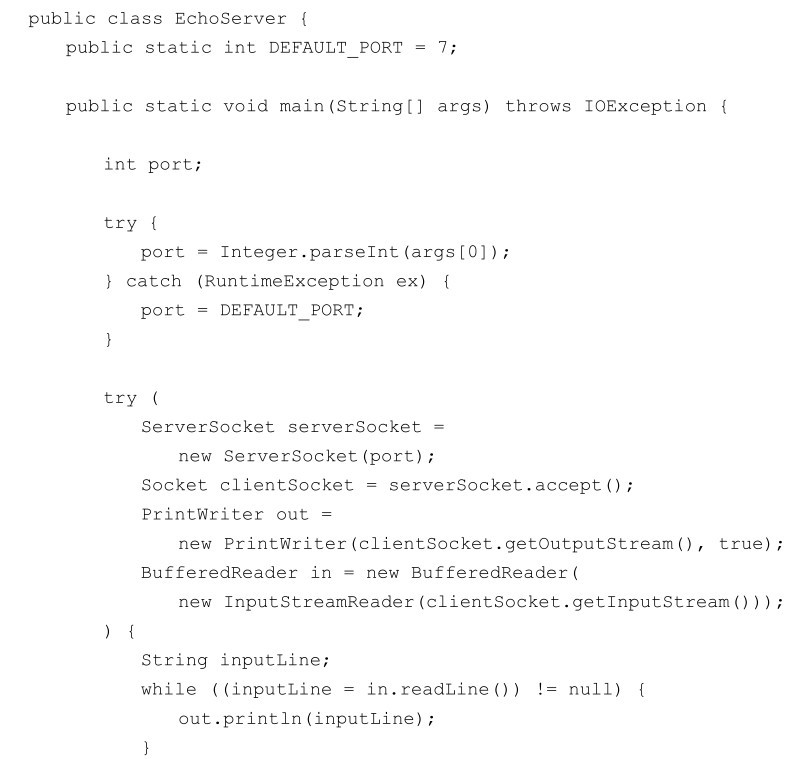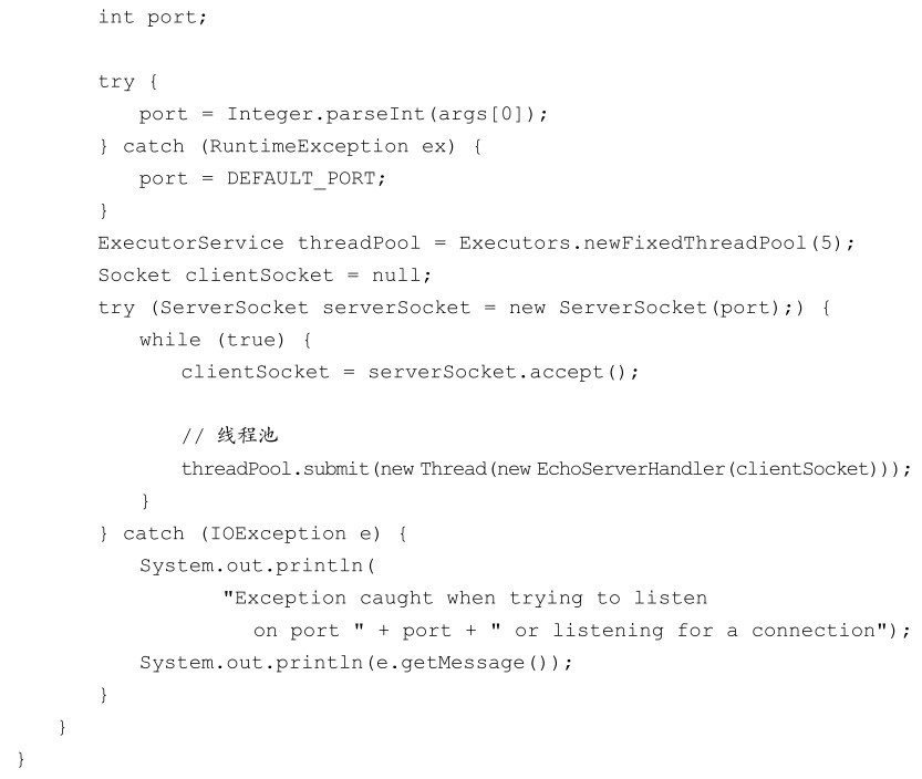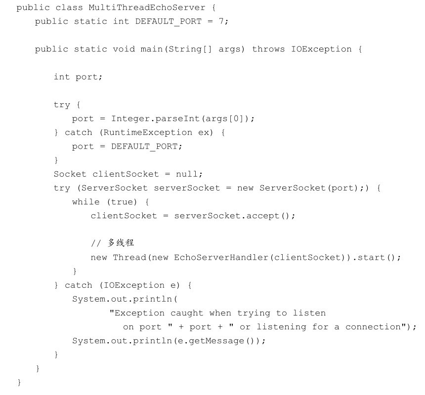 下面的EchoServer是一个简单的阻塞I/O例子,服务器启动后,等待客户端连接。在客户端连接服务器后,服务器就阻塞读写数据流。