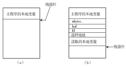 fd为一个整型数,表示一个文件。buf 为一个字符数组,用于存储读入的数据。nbytes 为另一个整型数,用于记录实际读入的字节数。如果该调用位于主程序中,那么在调用之前堆栈的状态如图1-11(a)所示。为了进行调用,调用方首先把参数反序压入堆栈,即最后一个参数先压入,如图1-11(b)所示。在 read 操作运行完毕后,它将返回值放在某个寄存器中,移出返回地址,并将控制权交回给调用方。调用方随后将参数从堆栈中移出,使堆栈还原到最初的状态。