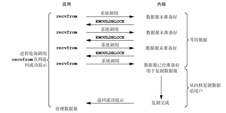 I/O操作函数将不断地测试数据是否已经准备好,如果没有准备好,则继续测试,直到数据准备好为止。在整个I/O请求的过程中,虽然用户线程每次发起I/O请求后可以立即返回,但是为了等到数据,仍需轮询、重复请求,而这是对CPU时间的极大浪费。