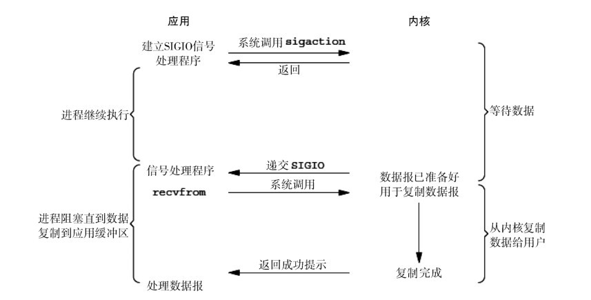 首先,我们允许socket进行信号驱动I/O,并通过调用sigaction来安装一个信号处理函数,进程继续运行并不阻塞。当数据准备好后,进程会收到一个SIGIO信号,可以在信号处理函数中调用recvfrom来读取数据报,并通知主循环数据已准备好被处理,也可以通知主循环,让它来读取数据报。
