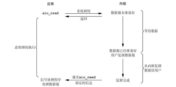 调用aio_read函数,告诉内核传递描述字、缓存区指针、缓存区大小和文件偏移,然后立即返回,我们的进程不阻塞于等待 I/O 操作的完成。当内核将数据复制到缓存区后,才会生成一个信号来通知应用程序。