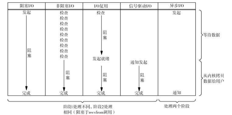 注: 读者若想深入了解UNIX的网络知识,推荐阅读W.Richard Stevens的UNIX Network Programming,Volume 1,Second Edition: Networking APIs: Sockets and XTI。本节只简单介绍了这5种模型,文中的图例也引用自该书。