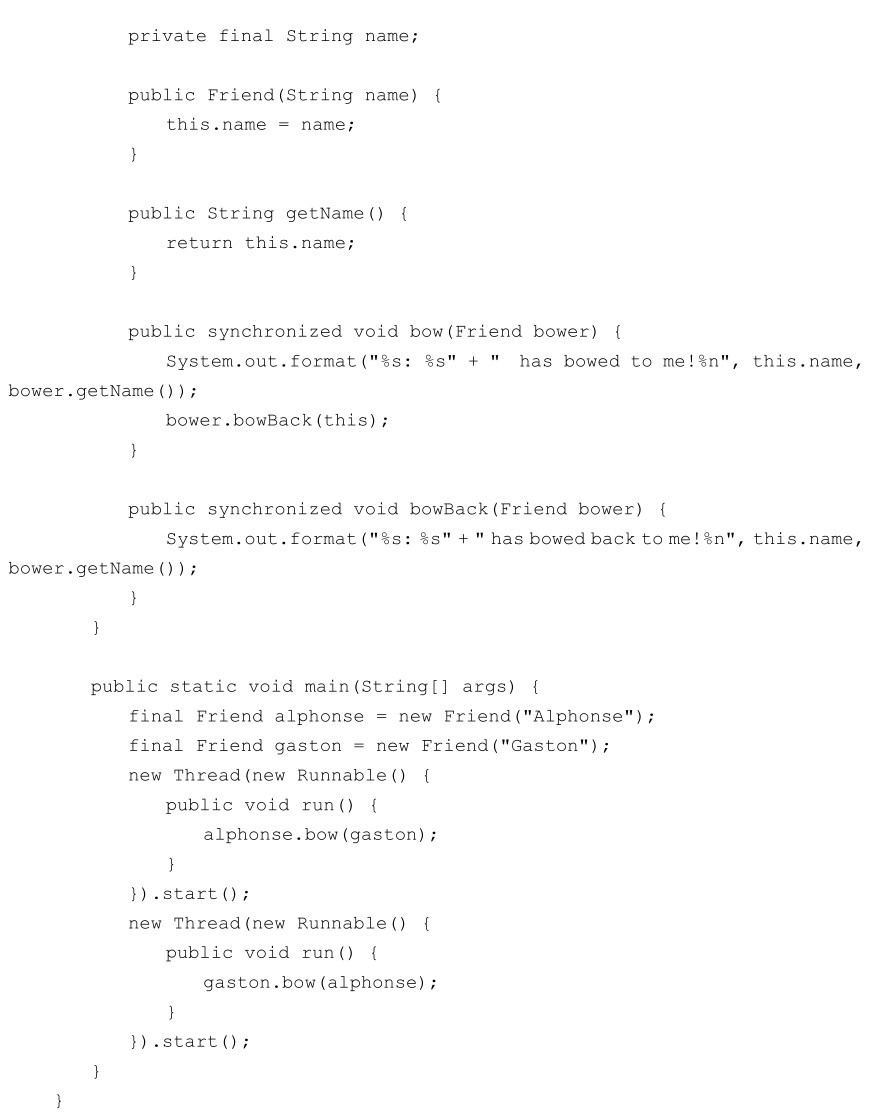 Alphonse和Gaston是朋友,都很有礼貌。礼貌的一个严格的规则是,当你给一个朋友鞠躬时,你必须保持鞠躬状态,直到你的朋友也给你鞠躬。不幸的是,这条规则有个缺陷,那就是如果两个朋友同一时间向对方鞠躬,就永远不会结束。在这个示例应用程序中,死锁模型是这样的: