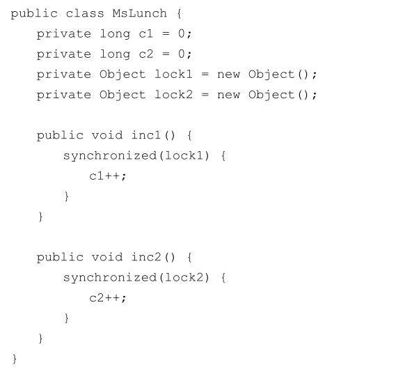 在改善并发性时,巧妙地使用同步语句能起到很大的帮助作用。例如,我们假定类MsLunch有两个实例字段,c1 和 c2,这两个变量绝不会被一起使用。所有对这两个变量的更新都需要进行同步,但没有理由阻止对 c1 的更新和对 c2 的更新出现交错——这样做会创建不必要的阻塞,进而降低并发性。此时,我们没有使用同步方法,或者使用和this相关的锁,而是创建了两个单独的对象来提供锁。