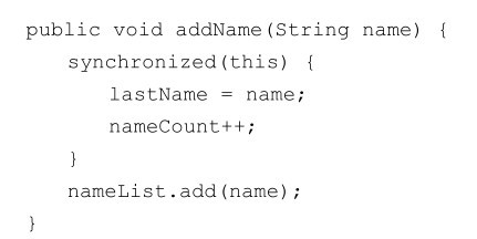 在上面的示例中,方法addName需要对lastName和nameCount的修改进行同步,还要避免同步调用其他对象的方法(在同步代码段中调用其他对象的方法可能导致“活跃度”中描述的问题)。如果没有使用同步语句,那么将不得不使用一个单独、未同步的方法来完成对nameList.add的调用。