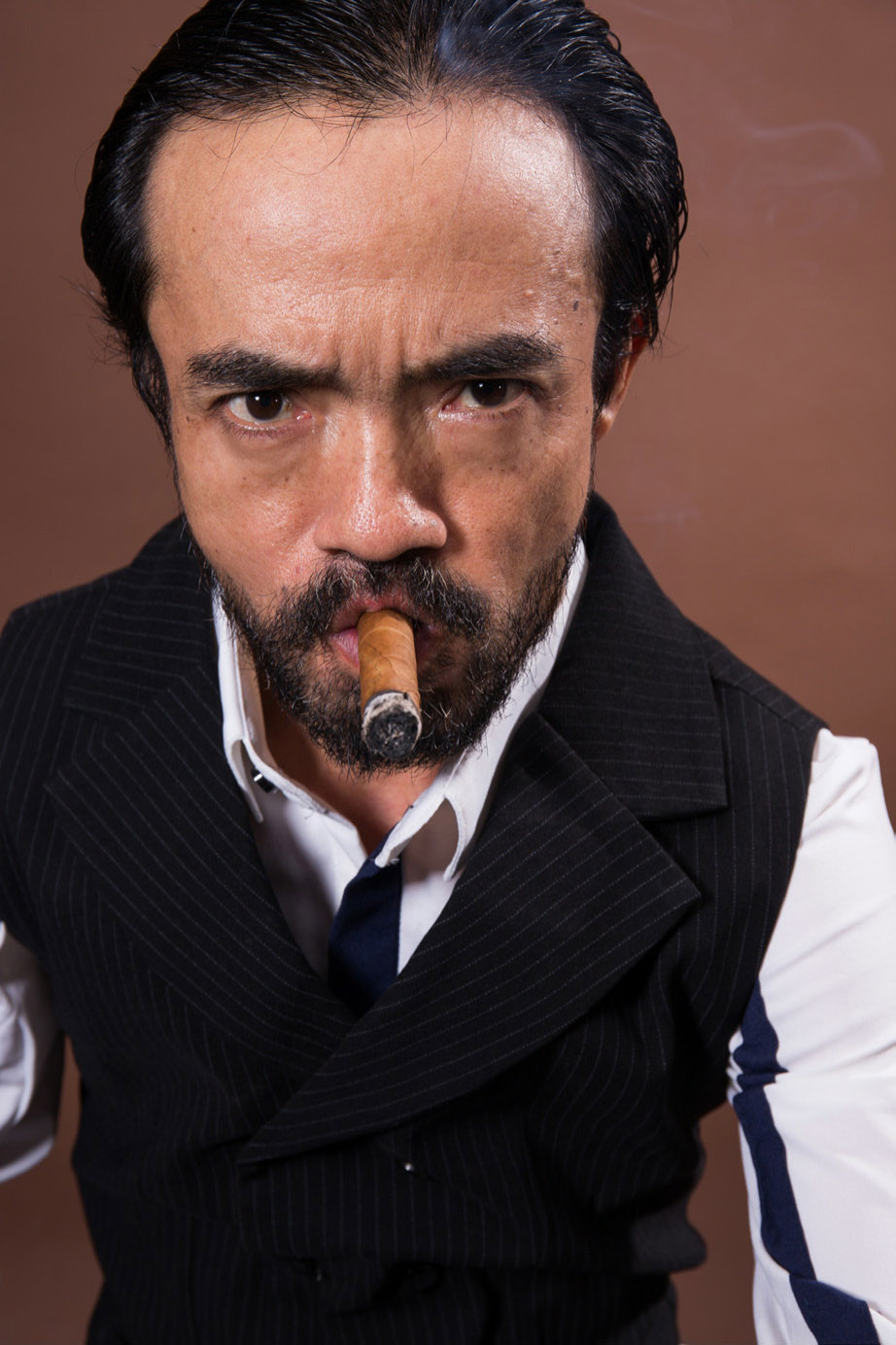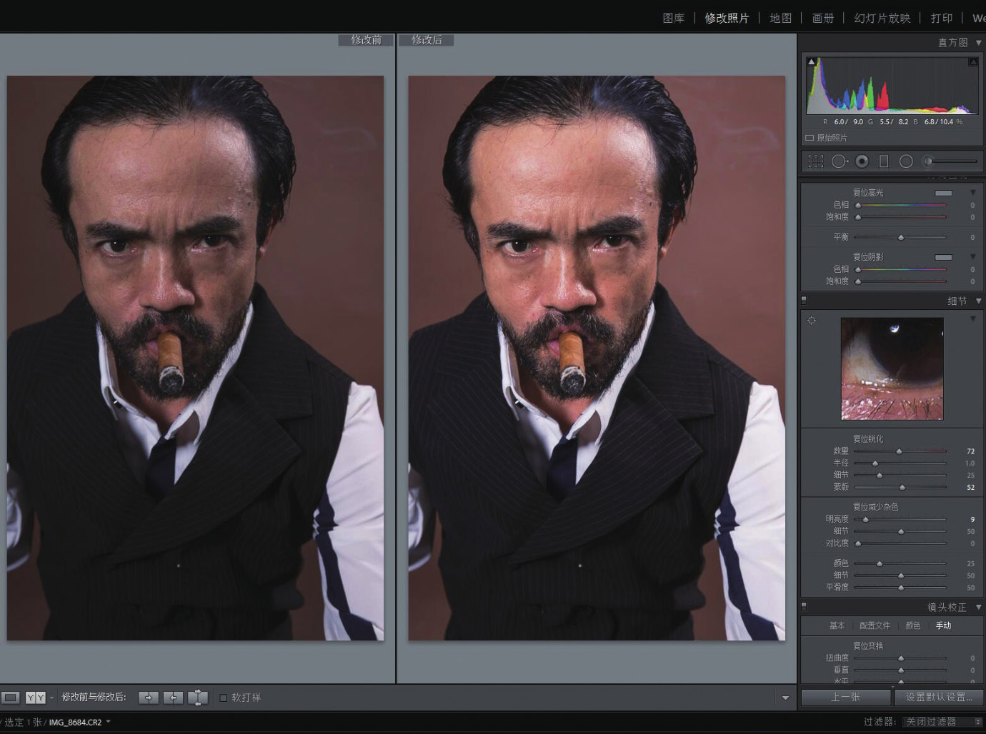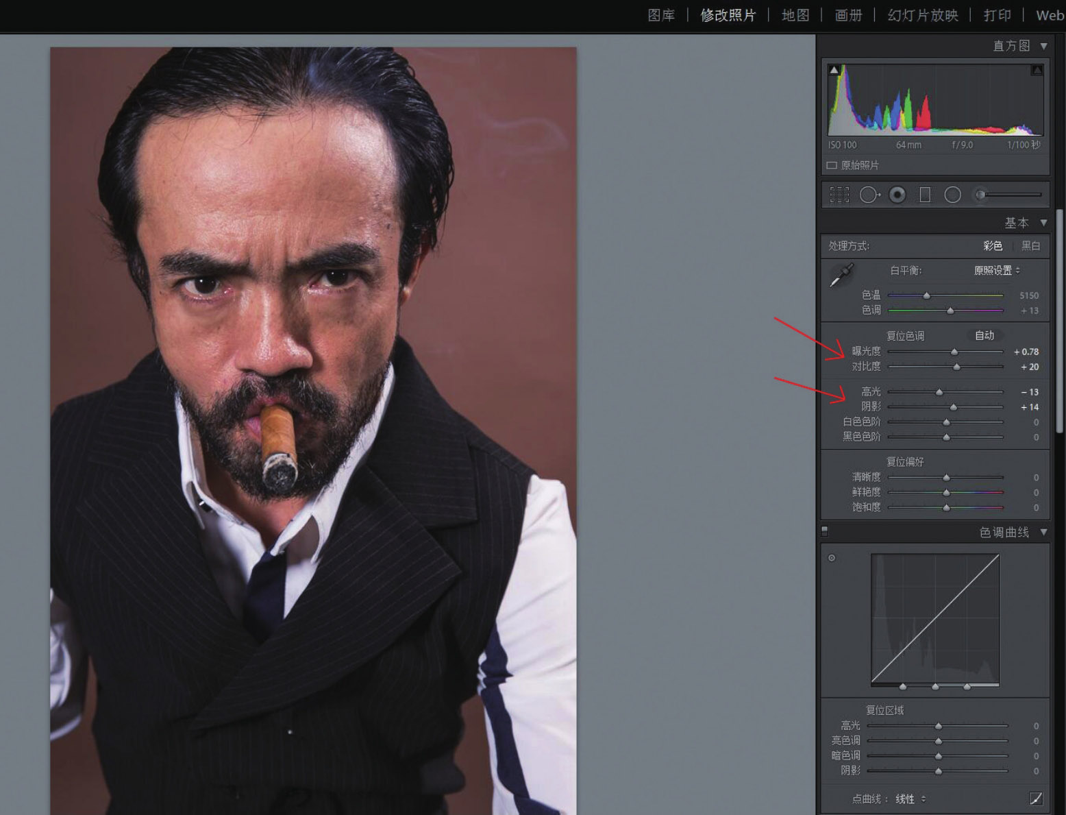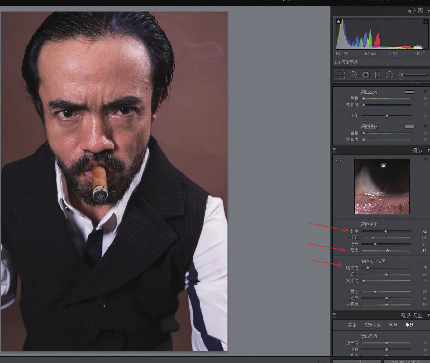 4. 这是导演郑平的肖像。通过提亮“曝光度”、增加“对比度”、减少“高光”调整白衬衫的过亮区域,增加“阴影”以突出黑马夹、眼珠、头发、胡子等细节。