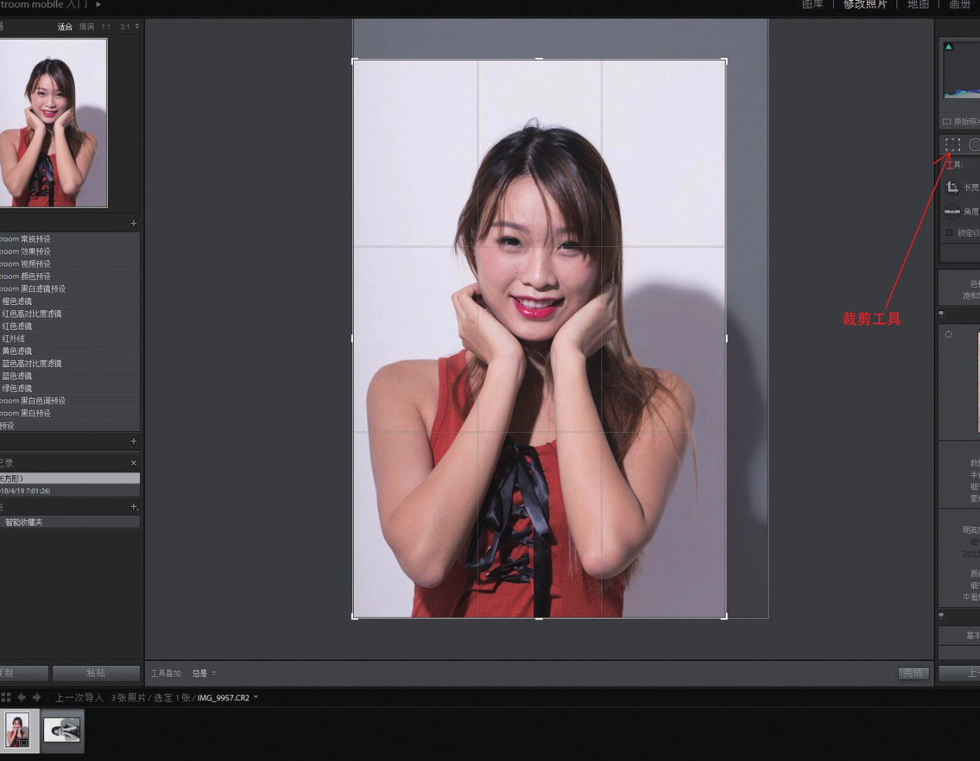 9. 按Ctrl+右中括号组合键,图像转为竖向。然后,单击右上角的“裁切工具”,把画面裁成合适的构图。
