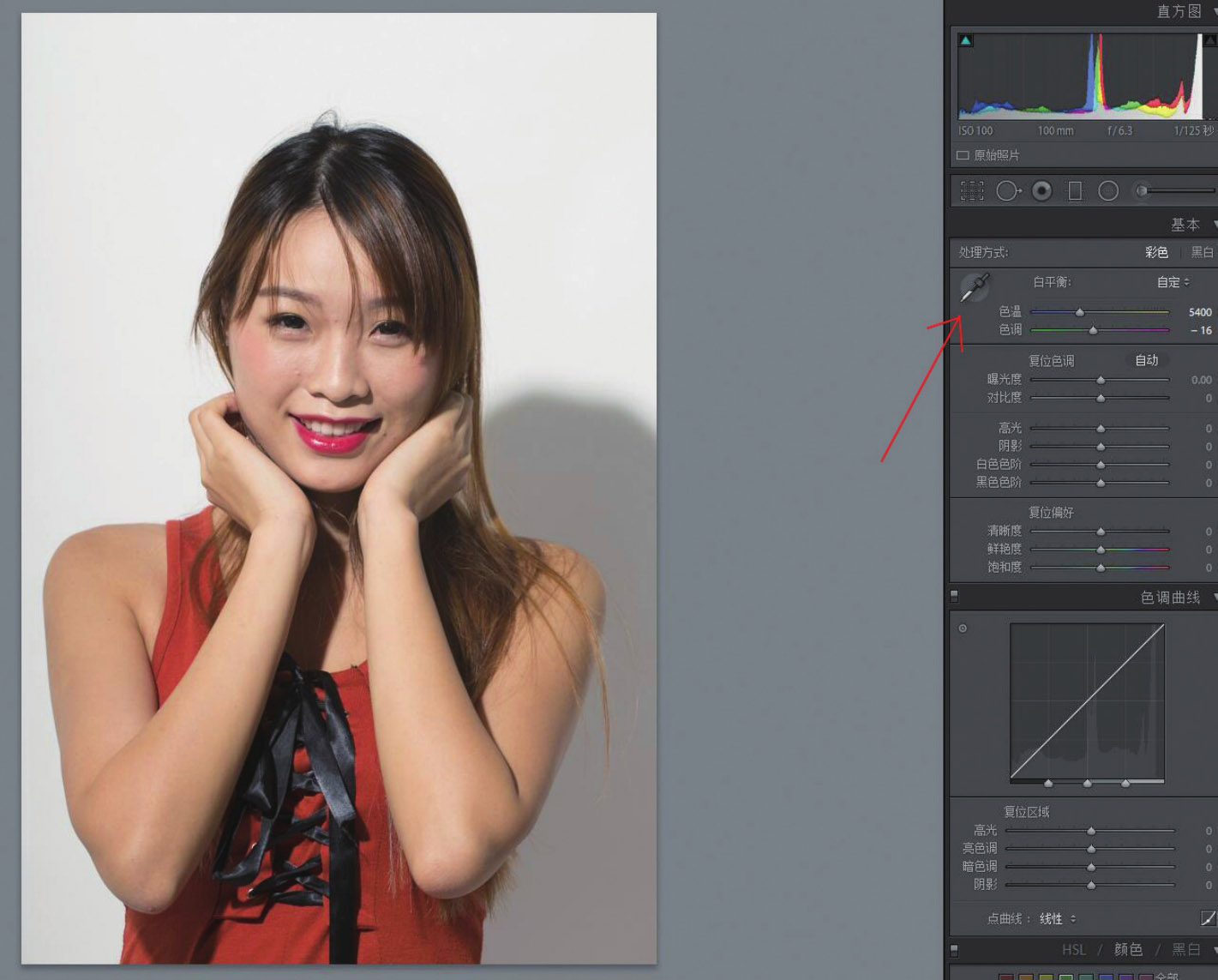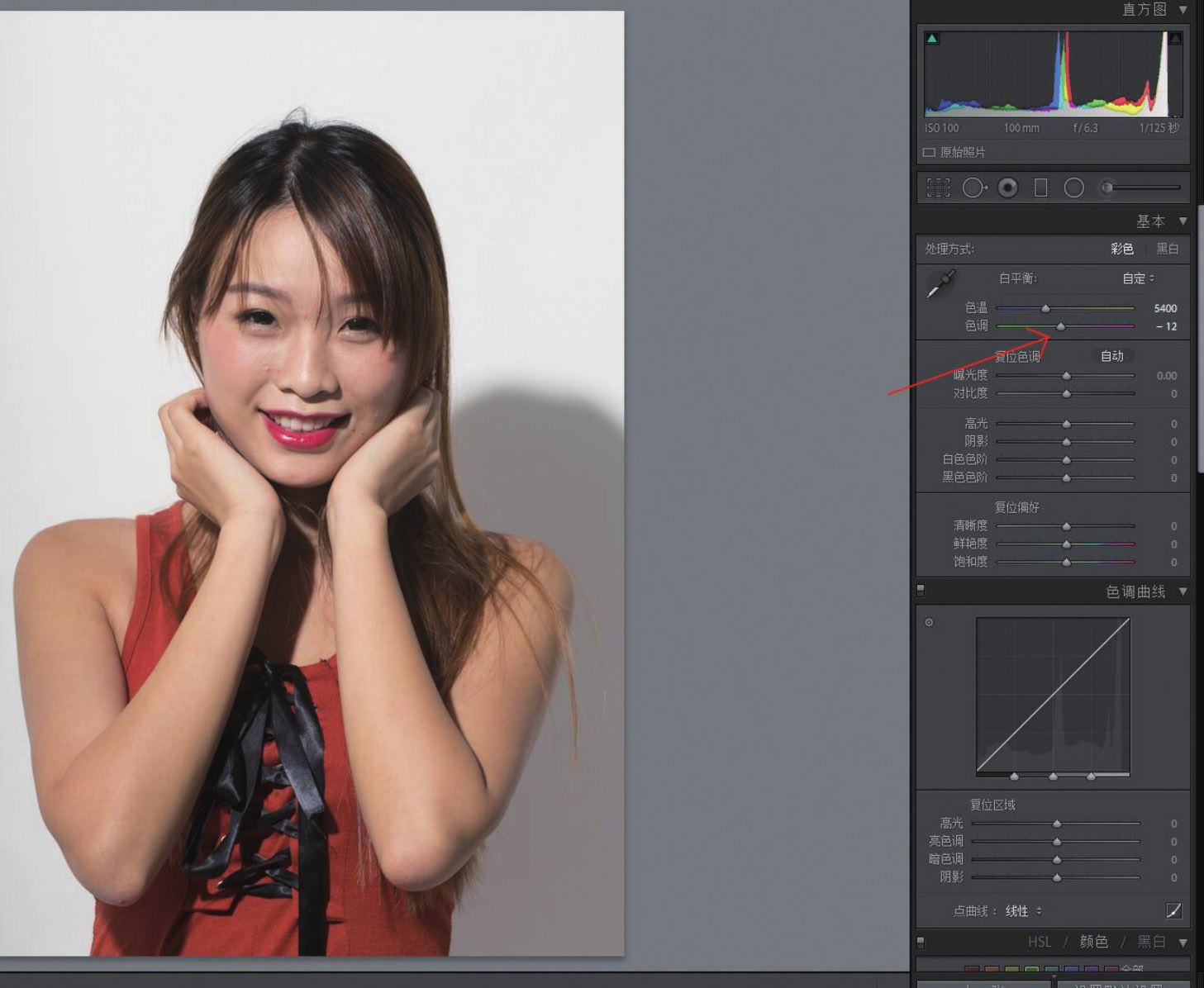 11. 拖动右侧“基本”面板中的“色调”滑块,让它稍微偏红一点儿。现在,绿色减少了,色彩正常了。