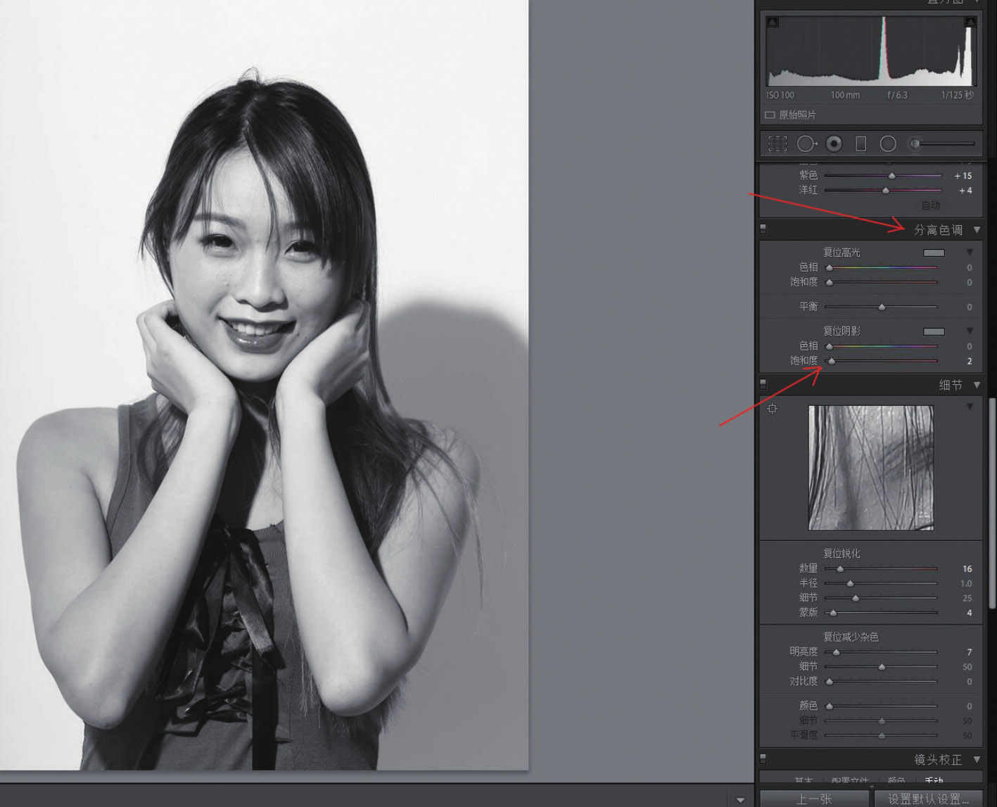14. 为暗部加上棕色或褐色色调是时尚人像黑白照片非常重要的一个环节。因此,在“分离色调”面板的“复位阴影”选项中把“饱和度”滑块往右稍稍拖动,为照片暗部加入了“色相”条上的棕色。这是一个细微的调整,也许在纸面上不太明显,但在计算机上能感受到棕色调所带来的魅力。