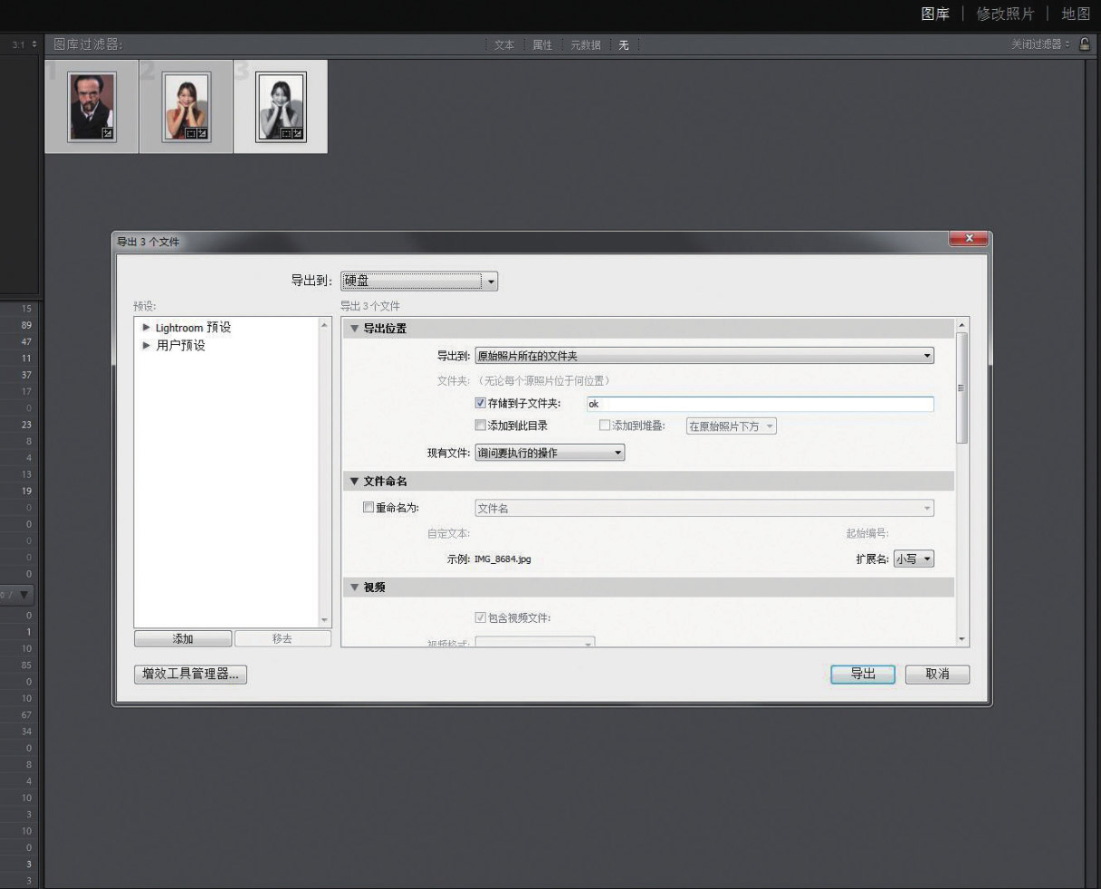 15. 回到“图库”模块,按Ctrl+A组合键选中所有图片,按Ctrl+Shift+E组合键,导出调整好的图片。一般会把它导出到“原始照片所在的文件夹”。