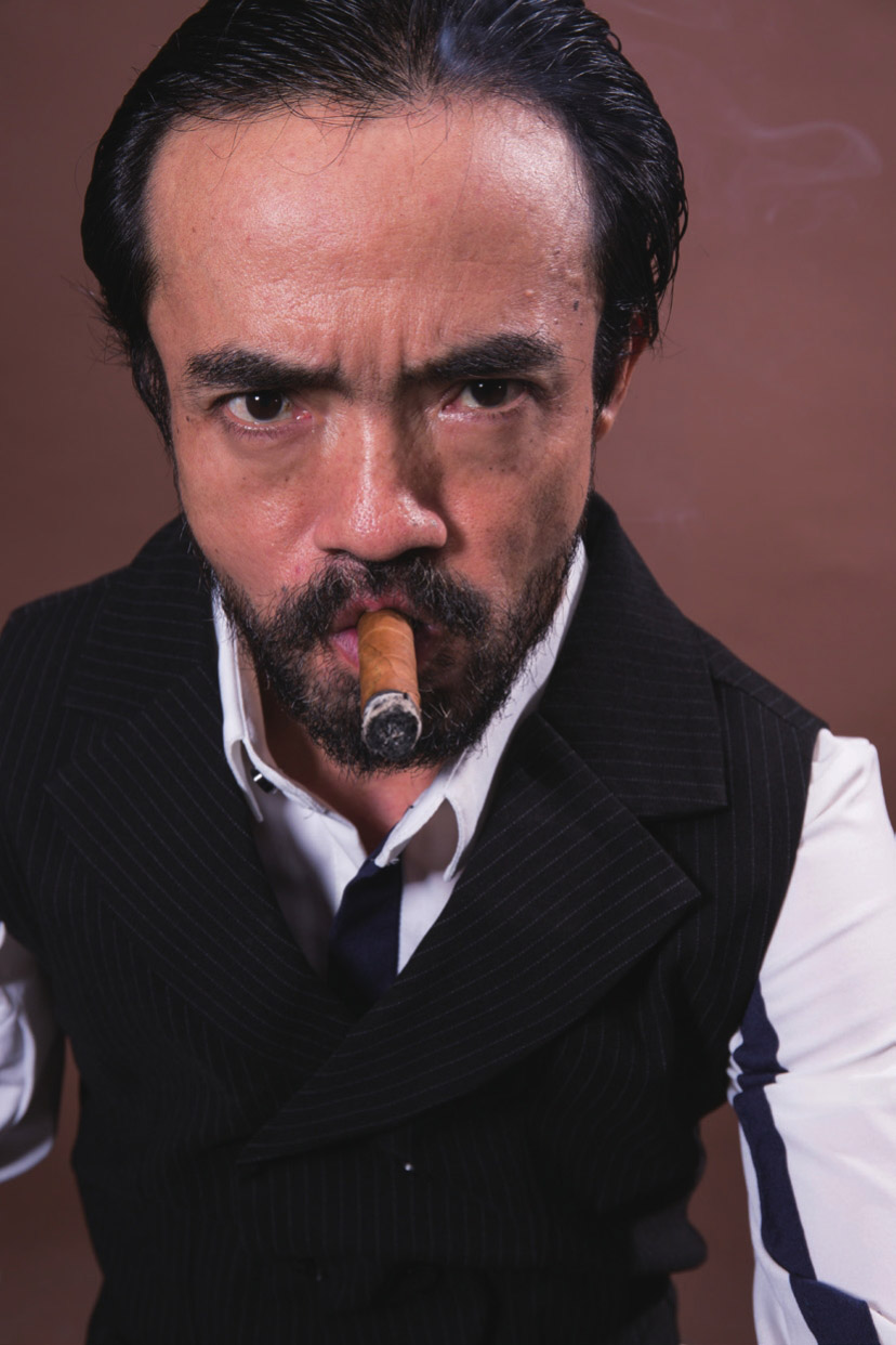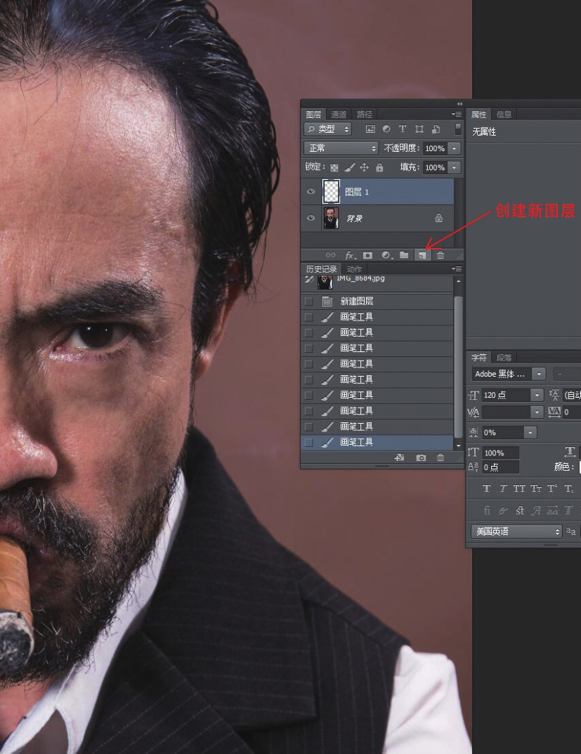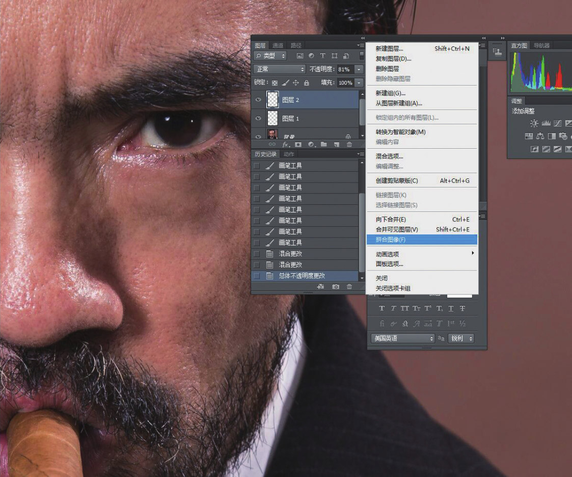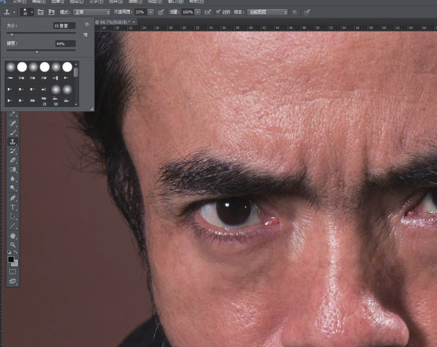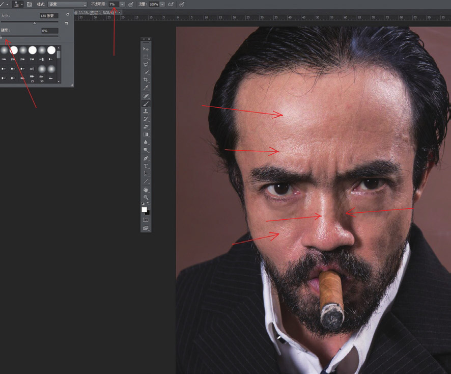 现在,先修郑平导演的照片。我们要做的事情很明确:修脏点;为额头、脸部三角区、鼻梁增加亮光;为眼白增加亮光提升眼睛的对比度;加重鼻梁的阴影。