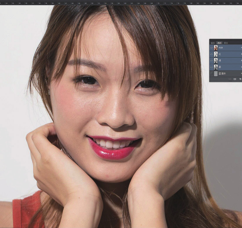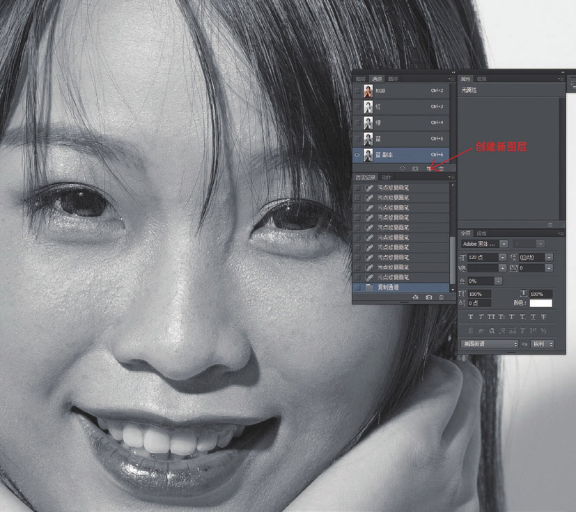 在“通道”面板将“蓝”通道拖到“创建新通道”图标(倒数第二个),建立一个“蓝副本”通道。因为在蓝通道里人物皮肤的辨识度最高(即使“RGB”通道也没有它的辨识度高),所以用“蓝”通道去寻找皮肤里的质感因素。