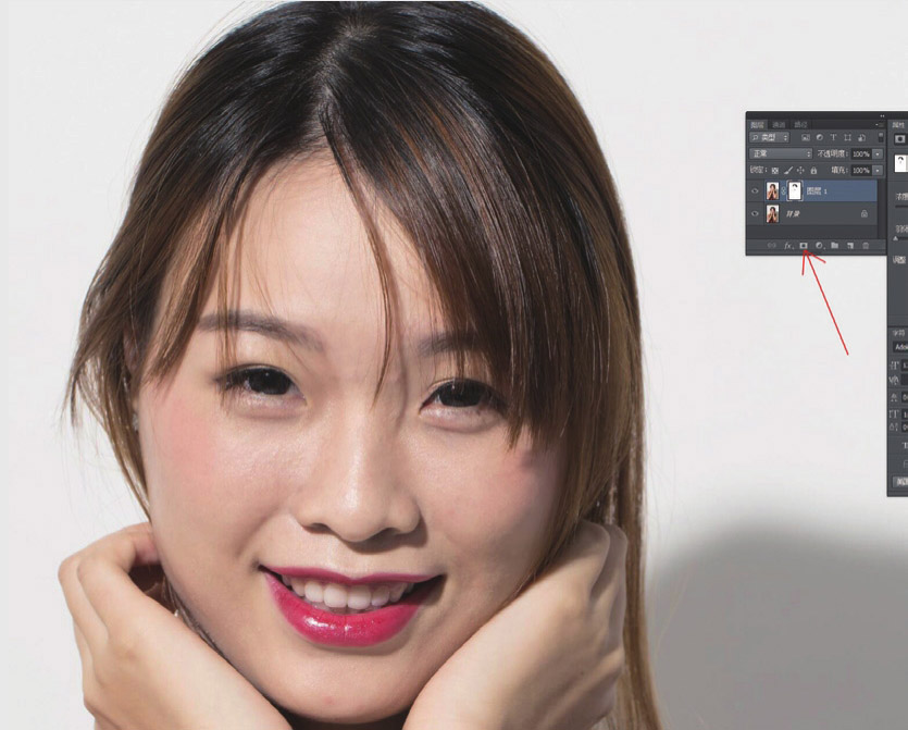 因此,给图层1加一个蒙版,然后用黑色画笔在上述位置擦除,于是,头发、眉毛、眼睑、嘴唇原有的质感就又回来了。