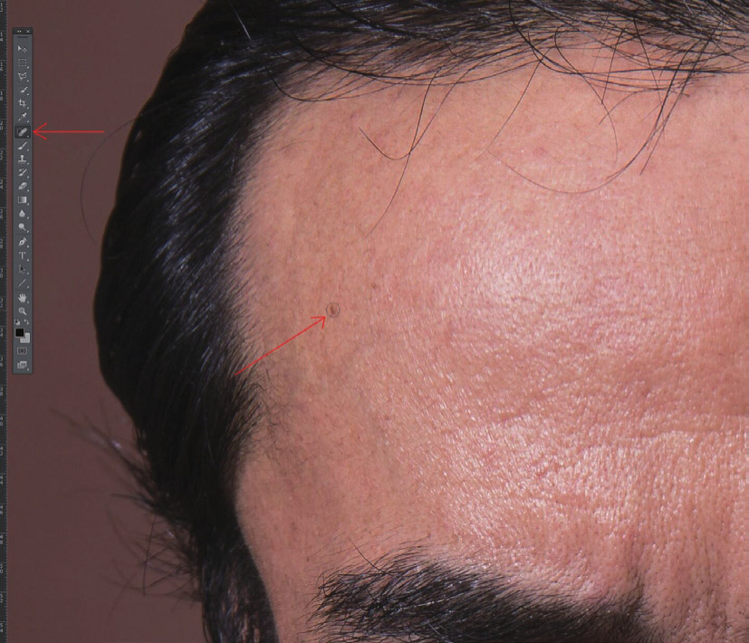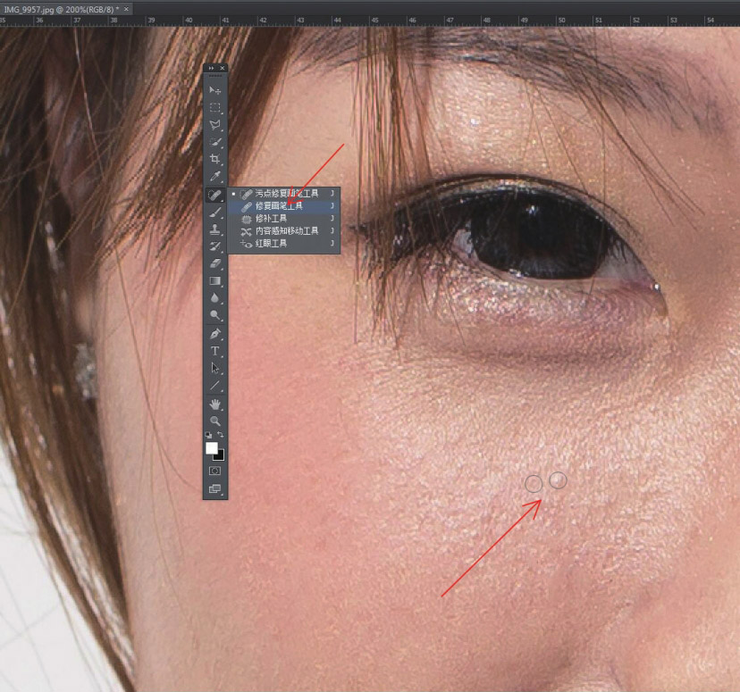 12. 用污点修复画笔工具先去掉脸部明显的瑕疵。具体做法:激活“污点修复画笔工具”,按Alt键并在瑕疵附近单击取样,然后单击瑕疵。