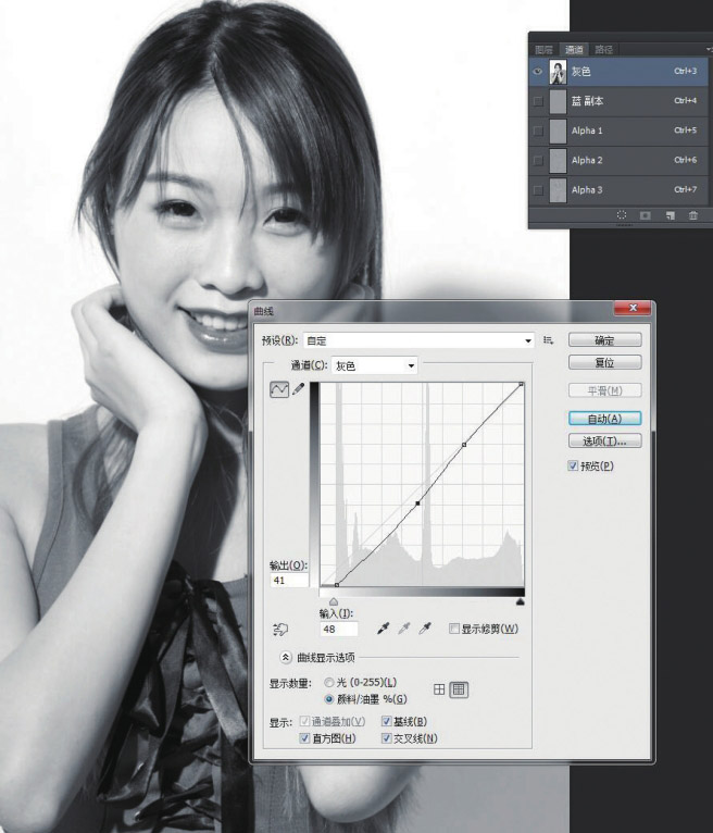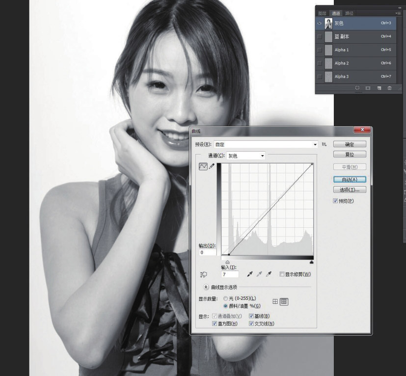 28. 按Ctrl+M组合键,弹出“曲线”对话框,单击“自动”按钮(先熟悉自动调整的效果,以后再手动调整曲线),增加画面的对比度,黑白照片的对比度一般要强过彩色照片。彩色照片突出色彩关系,黑白照片突出影调。