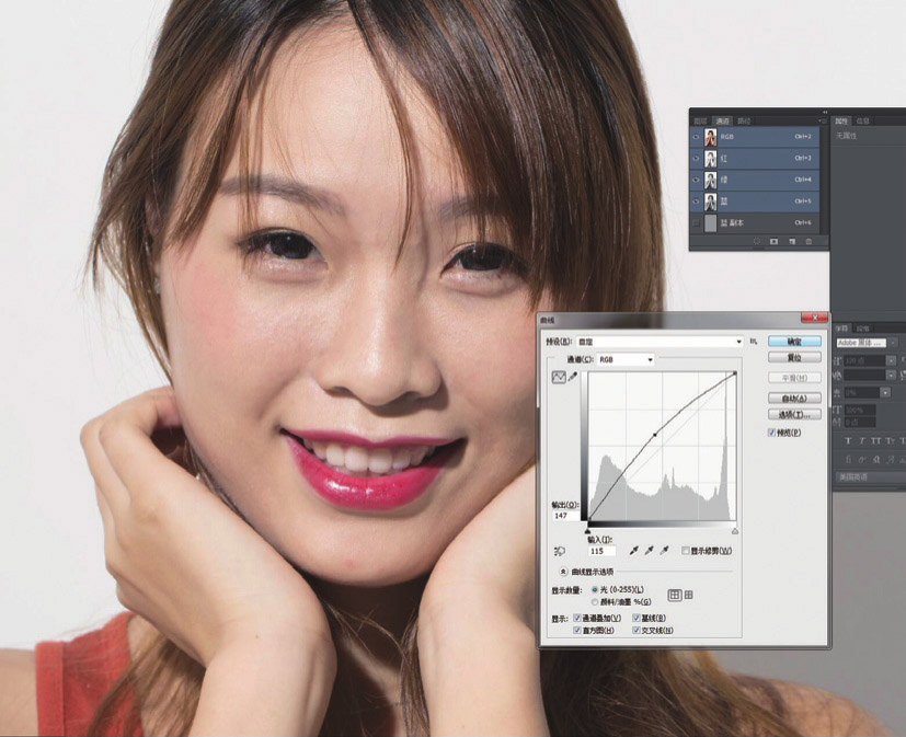 22. 按Ctrl+M组合键,用曲线工具提亮画面,可以看到皮肤的细节柔美了起来,光感也出来了。如果把曲线提得太高,皮肤会变成塑料质感。