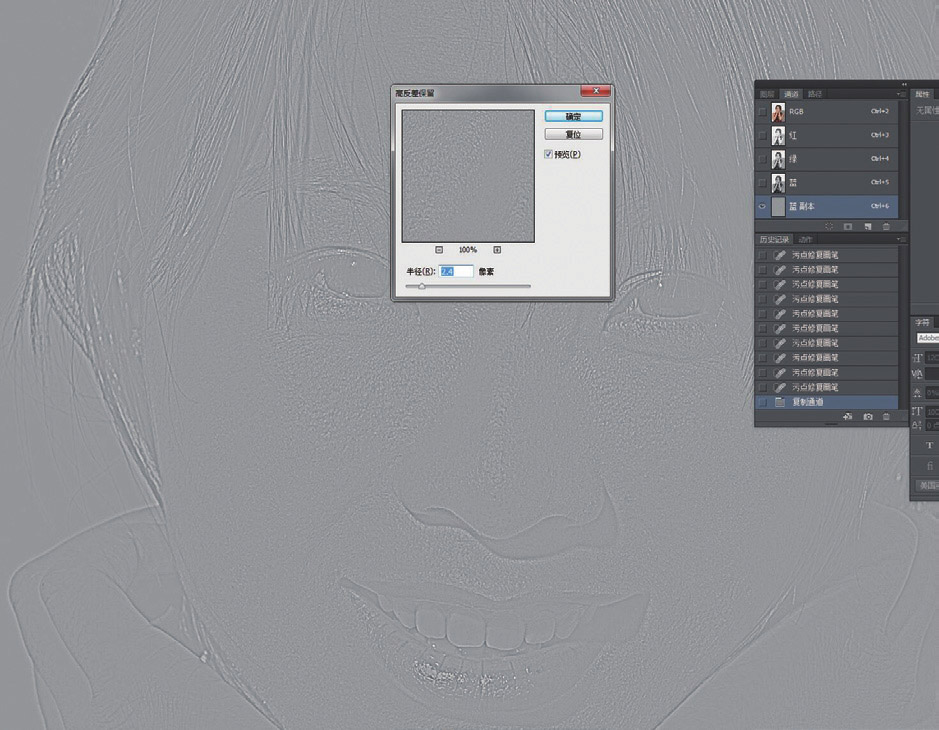 15. 在“高反差保留”对话框,设置“半径”为“2.4”,一个能够明显看到皮肤颗粒质感的数值。