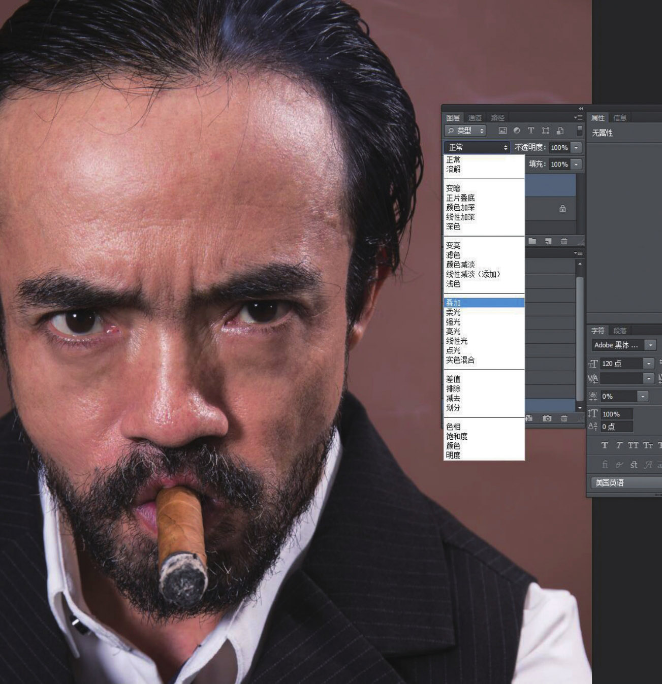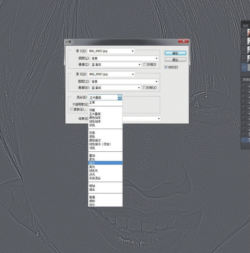 17. 在“计算”对话框,把“正片叠底”改为“强光”。